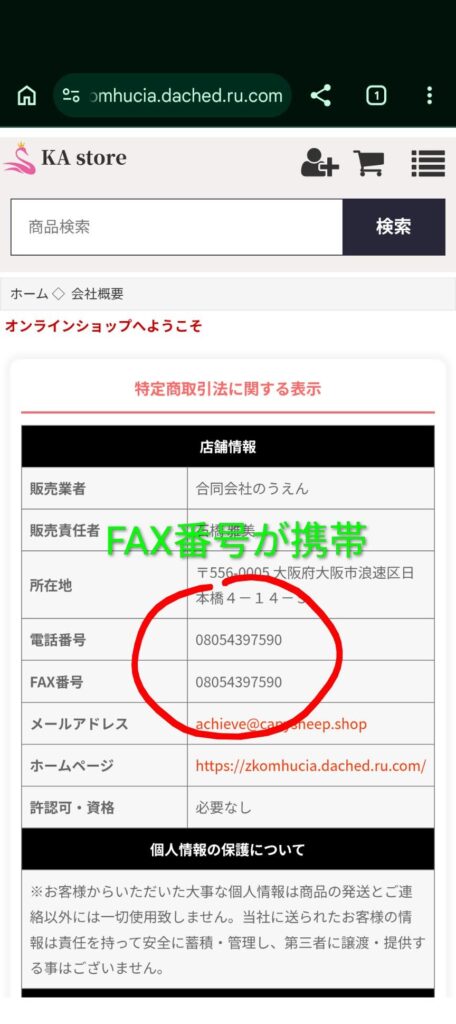 - 電話番号とFAX番号が、なぜか同じ携帯番号。