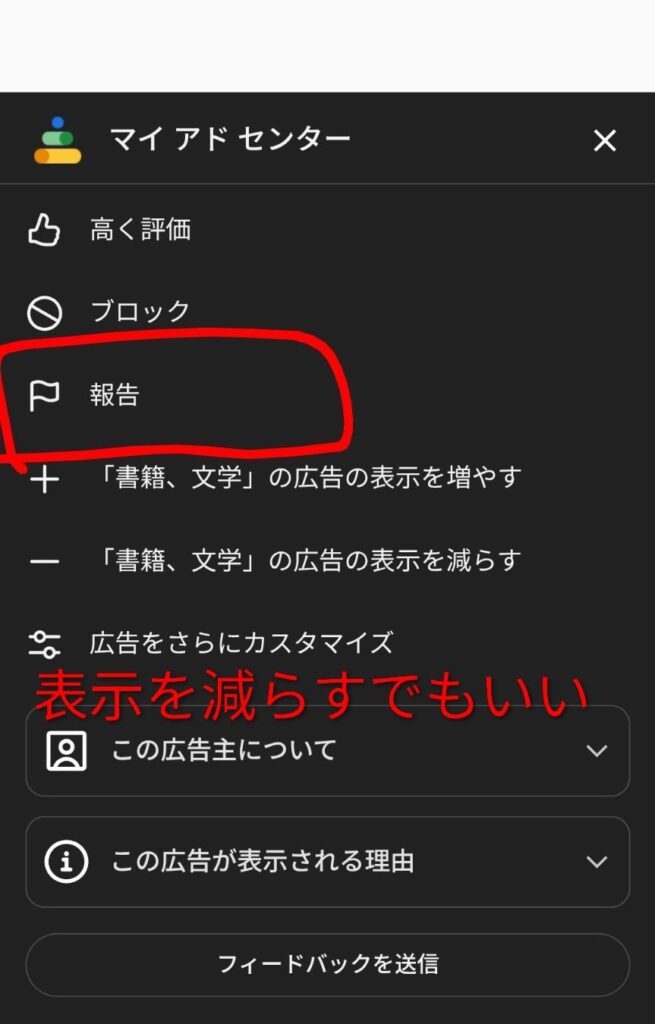 右端に3点メニューボタンがあります。タップすると画面が開きます。マイアドセンターが開くので、「報告する」をタップします。ほかに、「-ボタンで表示を減らす」でもいいです。