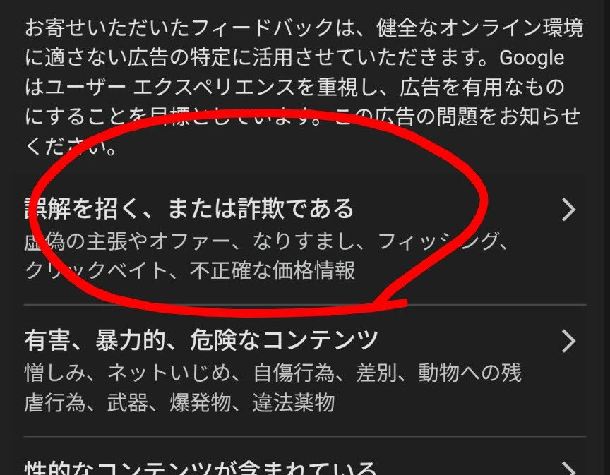 とても不快な広告なので、「誤解を招く、または詐欺である」を選択します。