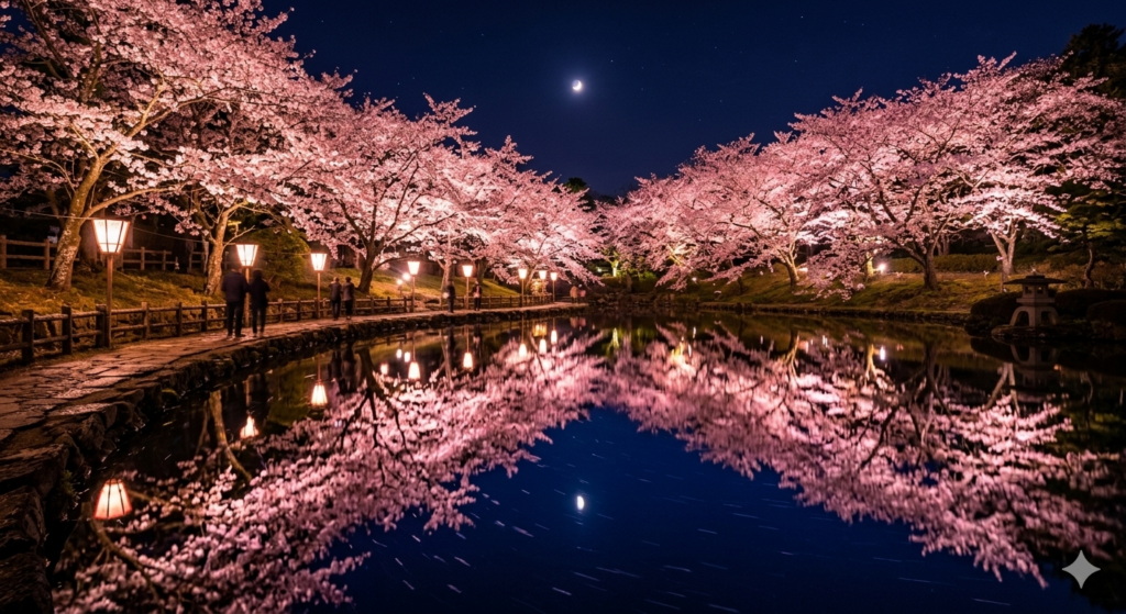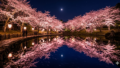 お堀や池に映る逆さ桜も綺麗だっていうので、見本を生成しました。