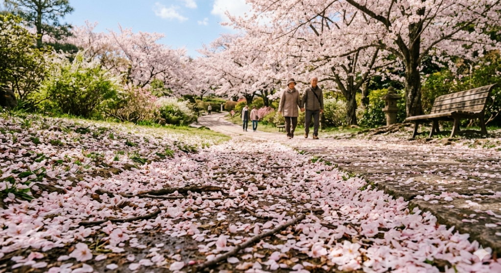 「水面(みなも)」や「足元」もシャッターチャンス! お堀や池に映る「逆さ桜」や、地面に広がった「花びらの絨毯」も、スマホなら地面すれすれから簡単に撮れます。人混みを避けて、自分だけの視点を探してみてください。
